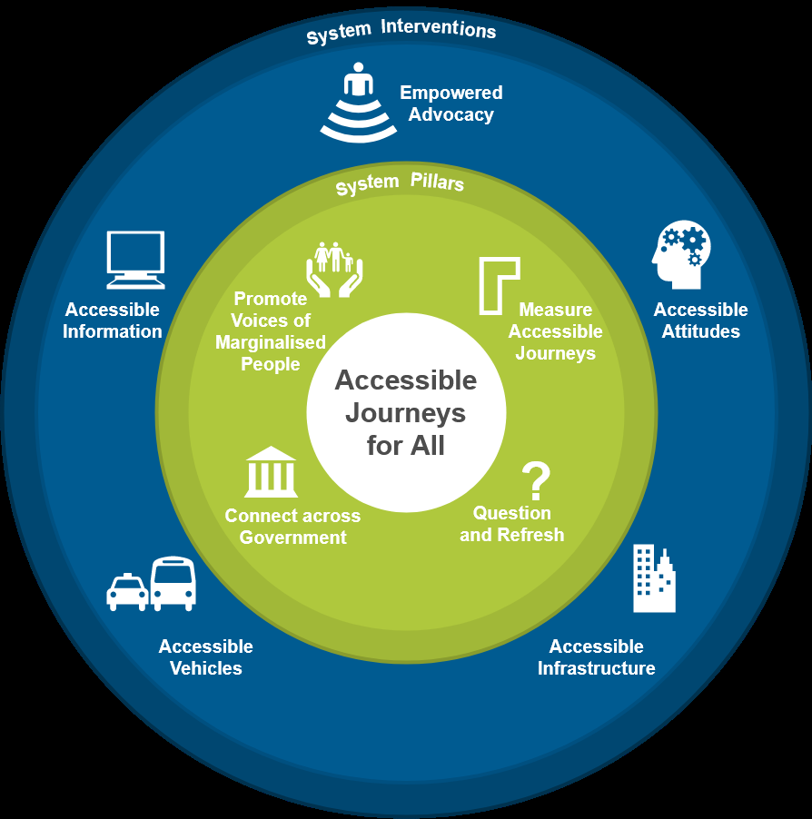 In our report for Waka Kotahi, we recommended a systems approach with a vision of accessible journeys for all. This should be supported by what we term ‘system pillars’ which connect the vision to actions. Finally, we describe five areas of intervention which group existing work into cohesive categories. By strengthening the system and improving the integration of the different agencies responsible, we can make real improvement to the accessibility of public transport.