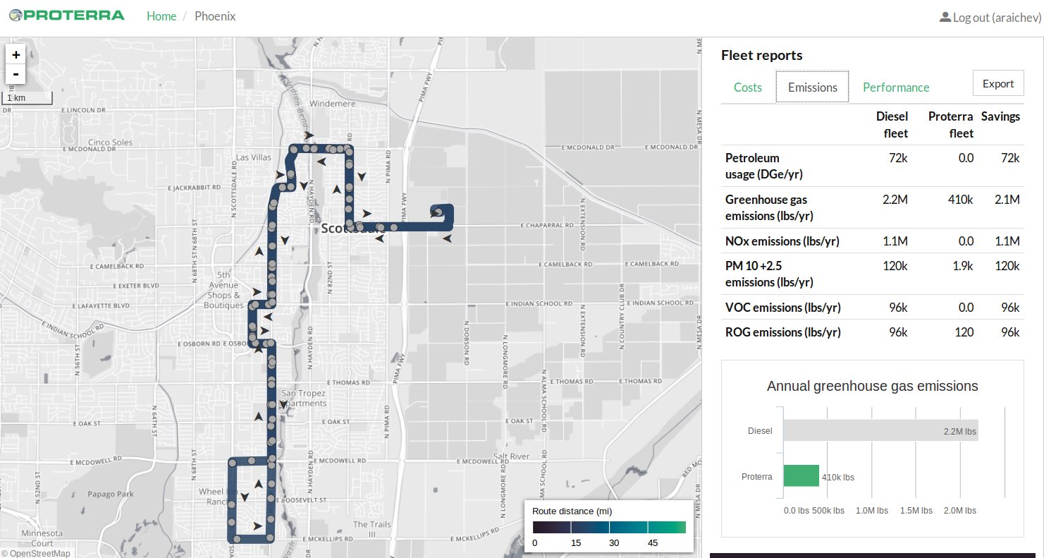 We have also worked directly with manufacturers of electric vehicles. In 2015 Proterra, a USA maker of electric buses, engaged us to create a bus simulator for their sales team. The result, EV Simulator, analyzes transit data in the form of General Transit Feed Specification (GTFS) files and applies Proterra's vehicle simulation logic to estimate the differences in costs, emissions, and performance between Proterra electric buses and standard diesel buses on each route of a given transit network.