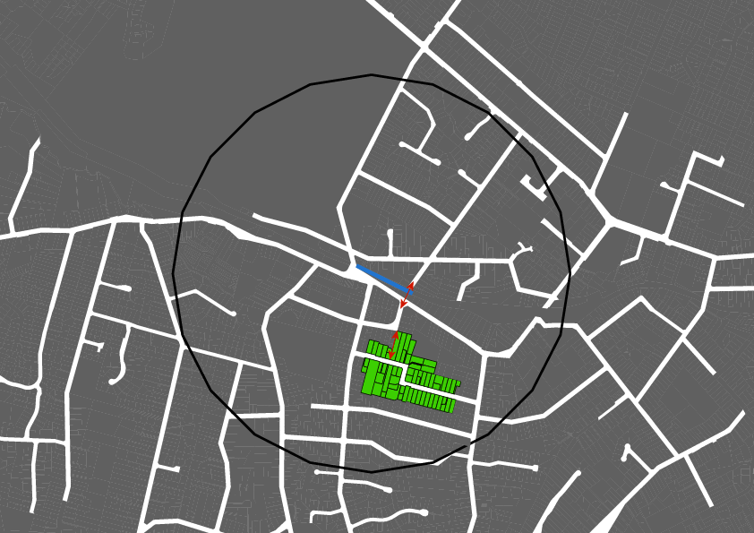 Again, we will use Glen Eden as an example. Let us see what would happen if we added a new connection through the street block to the south of our proposed new entrance, as indicated below.