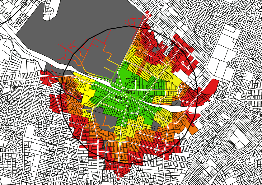 Below is a diagram of the walking catchment of Glen Eden Station with no interventions and scaled catchments to highlight the impact of the street network. Of particular interest is parcels highlighted in red within the 800m straight line catchment. The shortest route from these properties to the station are longer than 800m but have potential to be brought under 800m with interventions. The closer the red (and orange) parcels are to the centre of this catchment highlights where the street network creates particularly indirect journeys.