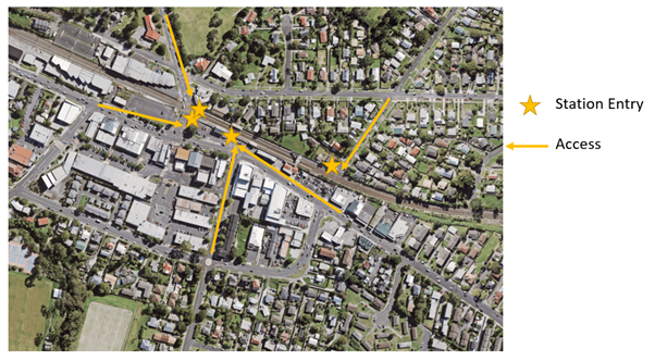 There is no better place to start than the location of the station entrances. This is something that lies directly within the public transport authorities’ control. Station entrances also lie at the centre of the walking catchment and can be high impact because they can improve access for a significant portion of the catchment and journeys. An intervention in the street block on the edge of the catchment will only improve the walking journeys for the people walking to the station from beyond the intervention.