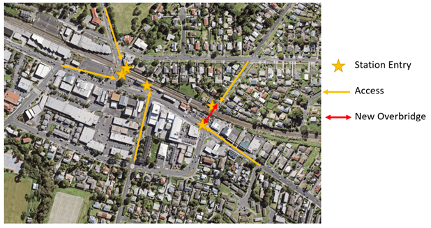 If we use Glen Eden Station in west Auckland as an example, we can see people coming from the east have to walk further along the road to get onto the outbound platform and then go around further to get to the citybound platform. So, to improve pedestrian access, we could open a new entrance on the southeast corner with a new pedestrian overbridge to make it easier and faster to get to the station.