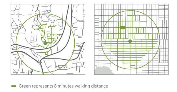 Subdivision patterns in Auckland have historically been ad-hoc outside of the central isthmus, as land transitioned from rural to suburban. This means we have some particularly large street blocks that can add a detour of hundreds of metres to any journey, which impacts walking most significantly out of all modes due to lower speeds. The image below shows how a fine gridded network better supports walking for all journeys, including to rapid transit, by allowing you to walk more directly to your destination. Improving permeability requires adding new connections for walking through larger street blocks.