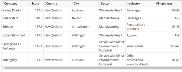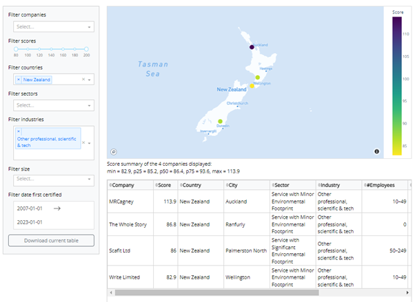 But we’re also data nerds who immediately started asking questions like, “How did we score against other companies in Aotearoa?”, “Who has the highest score?”, “How do we compare to other companies in our industry?” This information wasn’t easy to find, but we were able to track down a master database of B Corps. So, naturally, we took that data, our data visualisation knowhow, and built an app that allows you to sort, filter, and map certified B Corps. We couldn’t help ourselves.