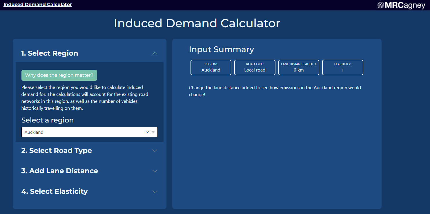 The calculator allows you to choose a region of interest, total lane-km to be added and a value for elasticity (the amount of induced demand response from a % increase in total lane-km). Existing total lane-km, emissions factor and VKT values are based on existing data of each region. Together, these values are used to estimate the induced emissions from an expansion.