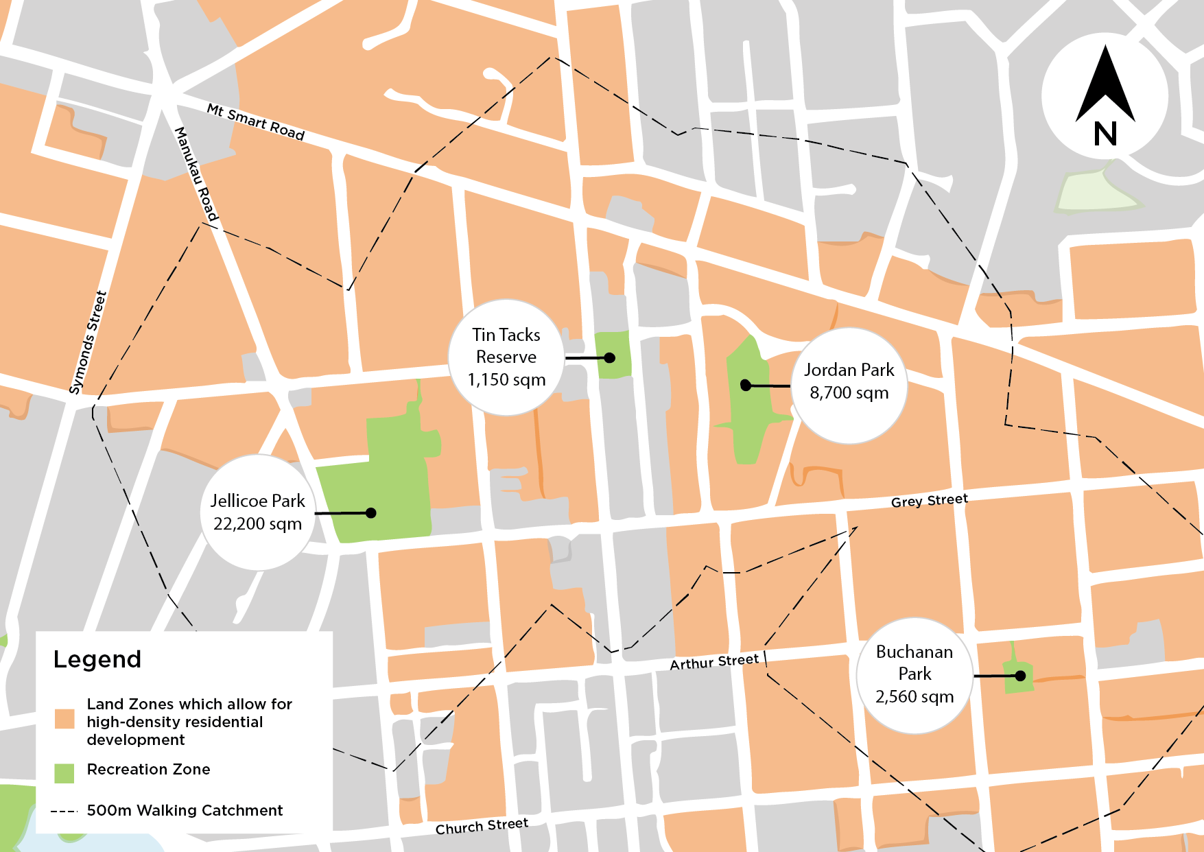 To illustrate this point, Scott posted a map of local parks near his home in Onehunga which showed the 500m walking catchment of those parks overlaying the high-density housing zoning.