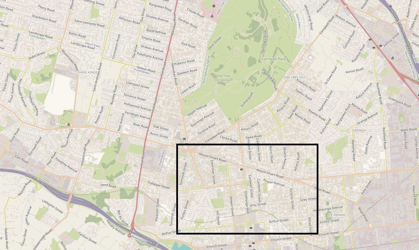 Those who know this area will know that just north of Onehunga lies Cornwall Park, one of the largest parks in the central isthmus of Auckland. While Scott is right to point out the potential for these parks to be seen as "magic pudding" to meet whatever demand is foisted upon them, I thought it a little disingenuous to exclude such a large public open space resource from his discussion. Below is a screenshot from OpenStreetMap which shows the extent of the map from Scott's article, as well as the many parks it didn't include.