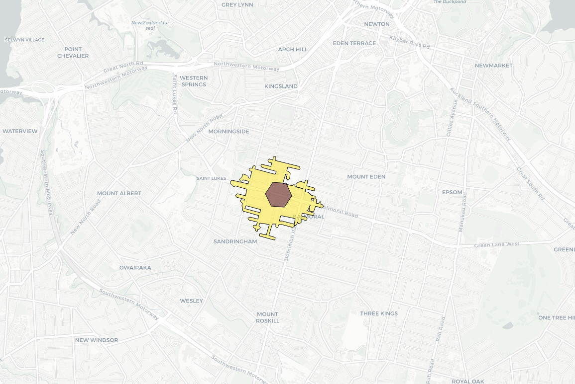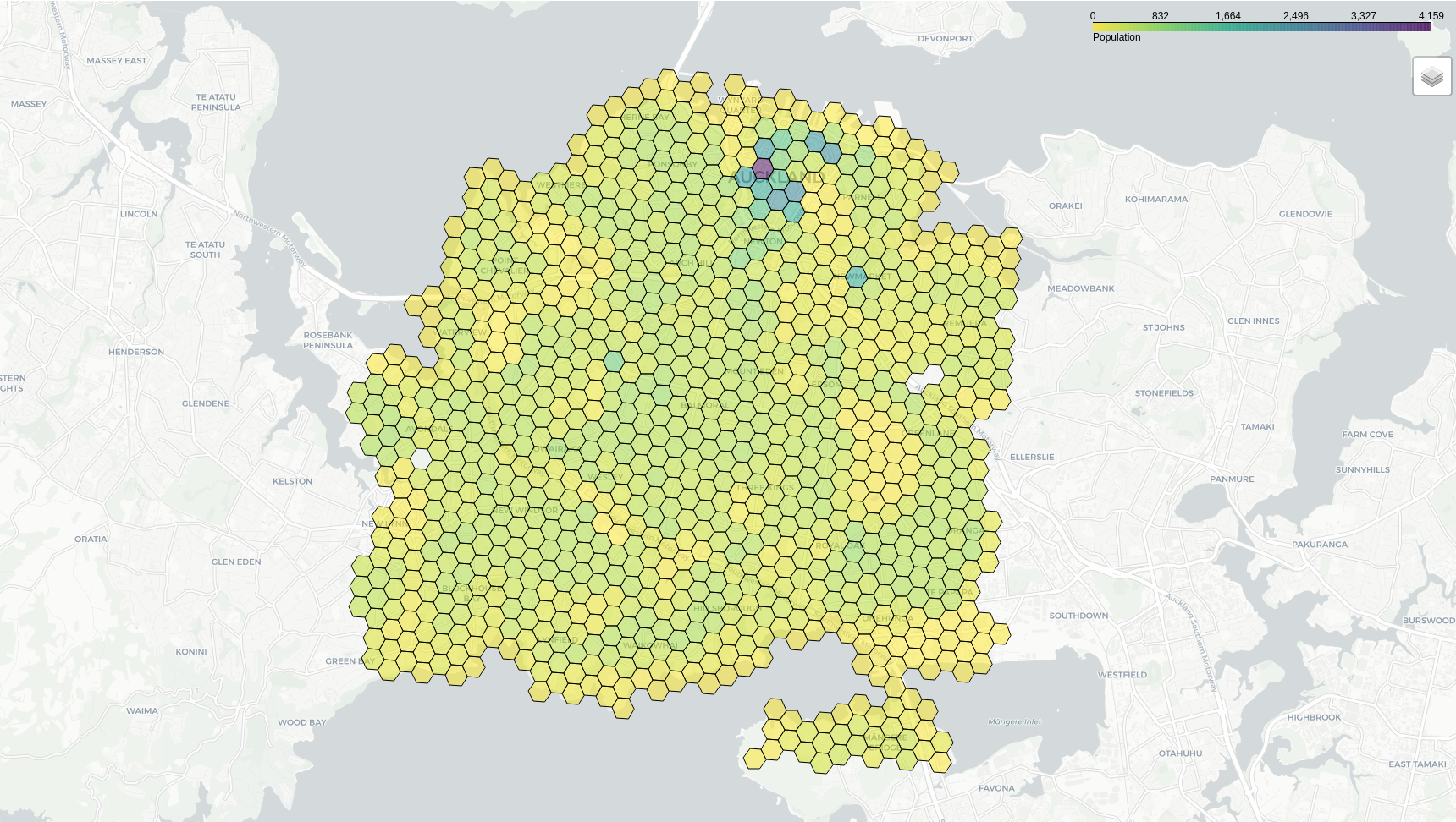 Using the 2018 New Zealand Census, I then mapped the population of the same region, separated into a hexagonal grid (for information on why I did this, see Hexagons are the Bestagons by CGP Grey). Unsurprisingly, there is a large population density close to the city centre, with a patchwork of low-medium density throughout the rest of the isthmus.