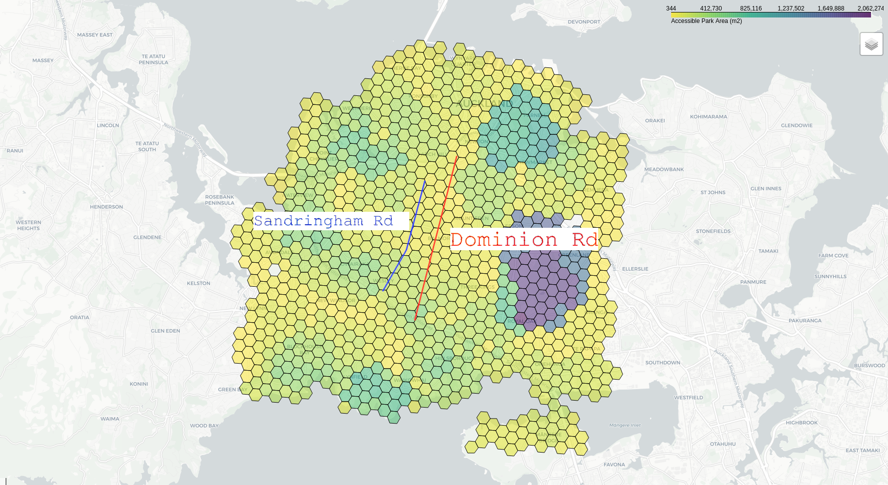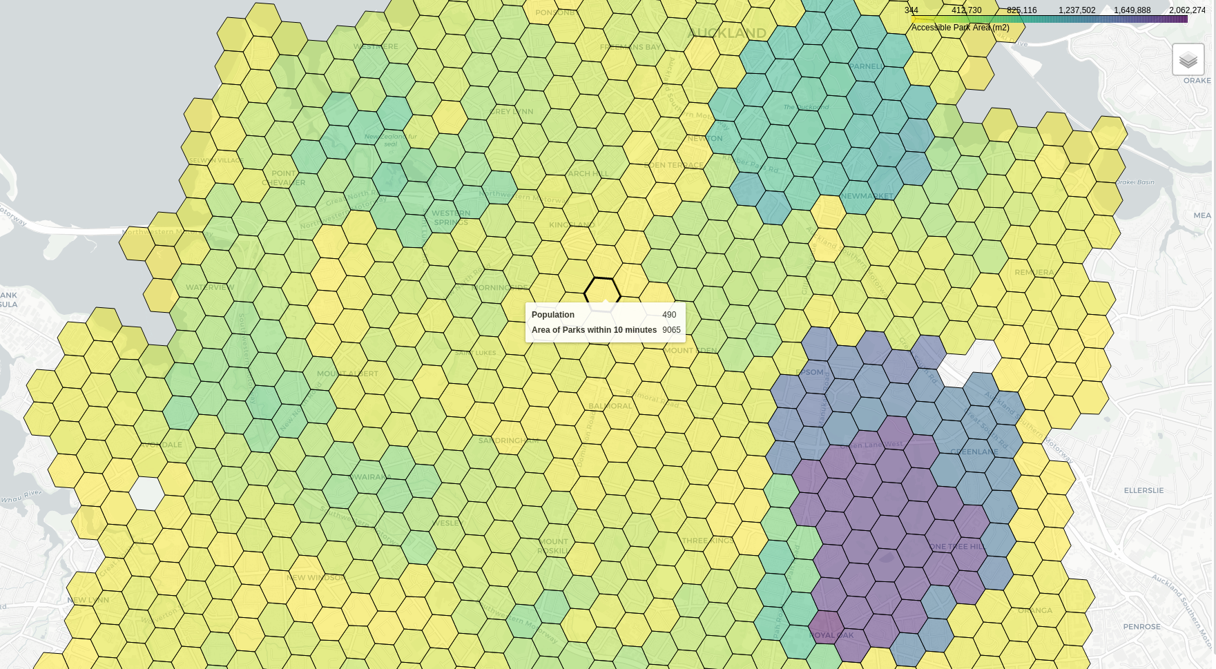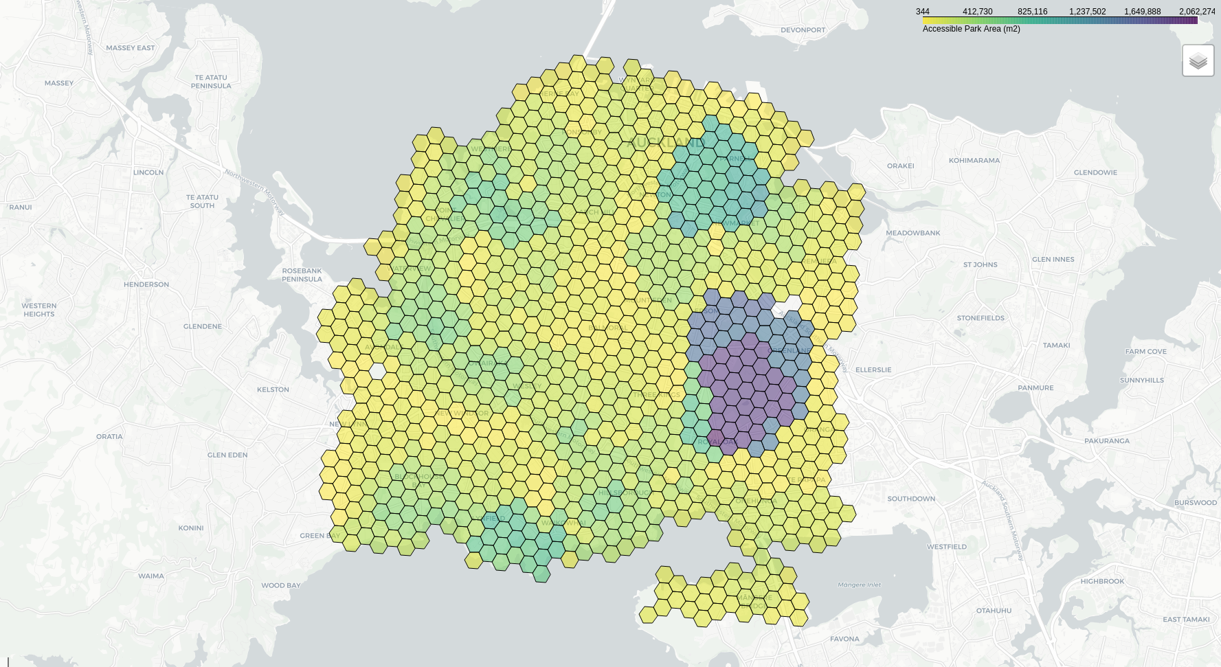 Colouring the cells of the hex grid by the total area of parks within a 10 minute walking catchment paints a picture of public open space accessibility in Auckland.