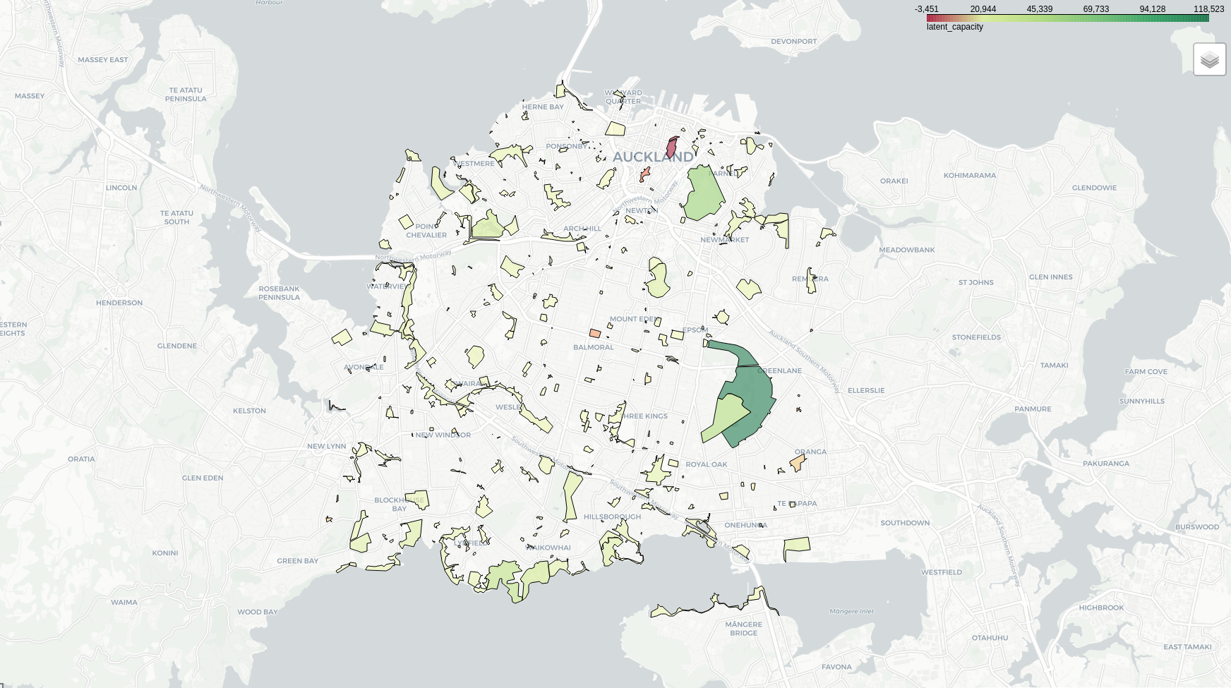 Conversely, in the suburbs there are both areas where people have little access to public space, and parks with plenty of latent capacity. Cornwall Park looks to have a lot of spare capacity - we just need to make it easier for people to walk there!