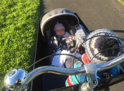 Our eldest, Ralph, was born in October 2016 and his first ride in the bakfiets was at about 5 months old. With Ralph, we were nervous first time parents – and busy renovating a house, but when Madeline was born in 2018 she had her first ride at just 3 weeks old, in a capsule. My husband secured a strap in the base of the box, which just had a rachet to easily secure the capsule in place (including a pillow from our couch placed between the capsule and bottom of the box).