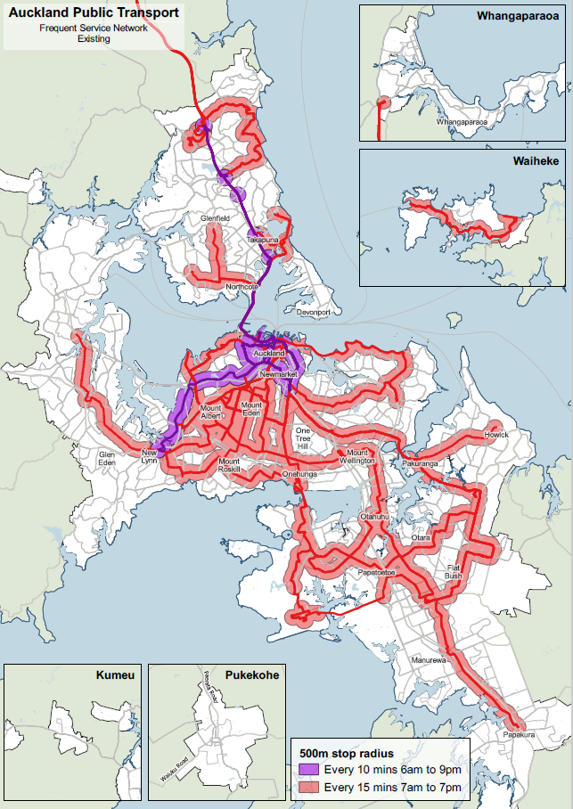 • Just about every main radial and crosstown bus route on the North Shore, West Auckland, the central isthmus and across South and East Auckland running every ten minutes all day, every day, on a network linking every major suburb, shopping centre, employment zone in the region.