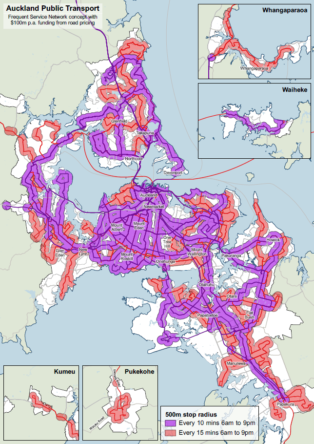 Spending half the annual revenue from the proposed road pricing scheme on public transport operations would upgrade Auckland’s bus, train and ferry network to a comprehensive connected system with turn-up-and-go services running frequently through practically every neighborhood in the region, from early morning to late evening, seven days a week. This would easily give Auckland the best ‘all day every day’ transit network in Australasia and go a long way to dealing with the equity issues of road pricing.