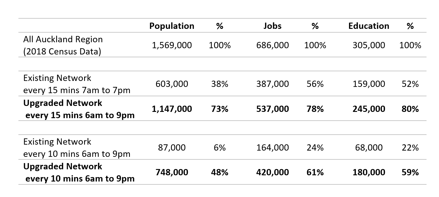 To quantify the effect of all these service upgrades, I crunched the catchments in GIS using census data on where people live, work and study in the Auckland region. Overall, this would mean three-quarters of the Auckland’s residents and 80% of jobs and education places would be within 500m of a bus stop, train station or ferry wharf served by routes running at least once every 10 to 15 minutes from 6am to 9pm, seven days a week.