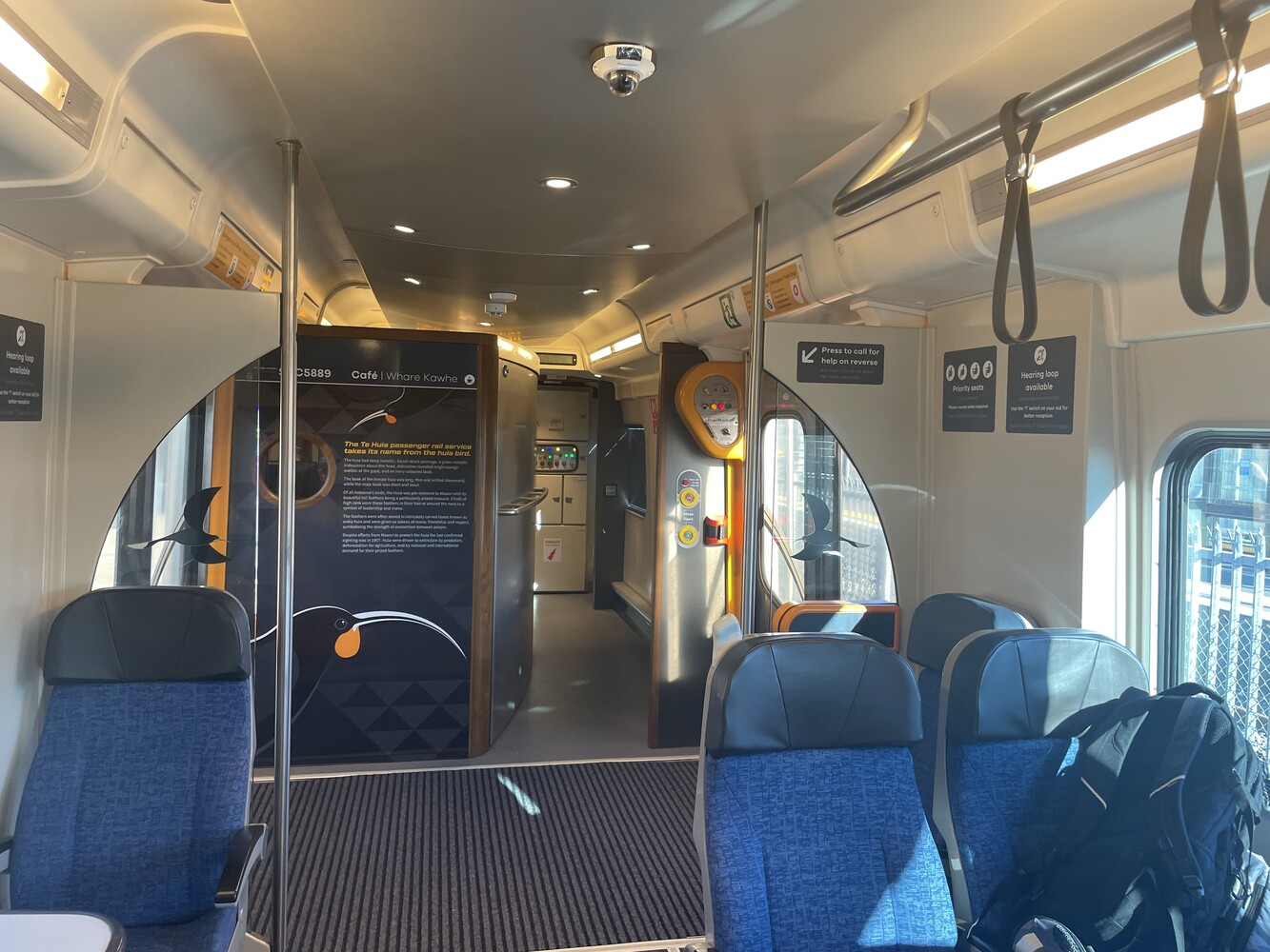 The train is designed to be accessible, so the café car has a chair lift, and the toilet is designed with a wide folding door. If anyone knows of anyone who uses a wheelchair who has taken Te Huia, we would love to hear about their experience.