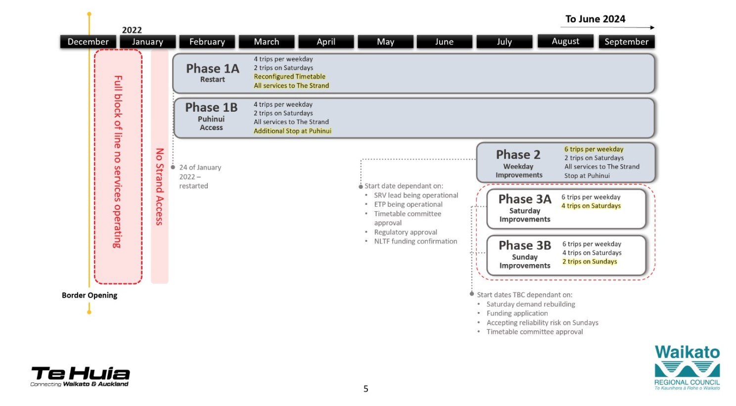 The timeframes are subject to rail maintenance and upgrades occurring on the Auckland rail network but to give full effect to the trial, we need to deliver more options that suit a greater variety of trips to truly test the market for inter-city rail.
