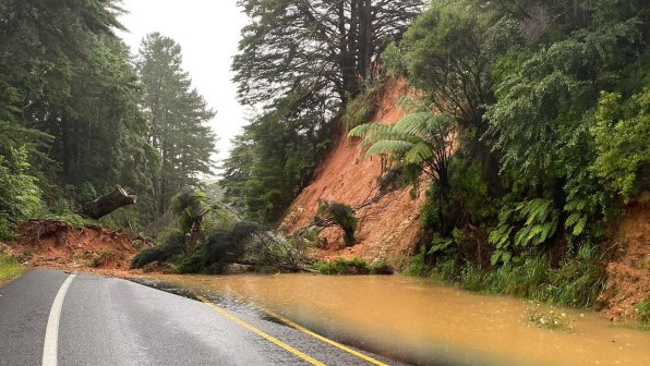 Slips and flooding closed SH1 near Puhoi in January 2023. Image source: Waka Kotahi