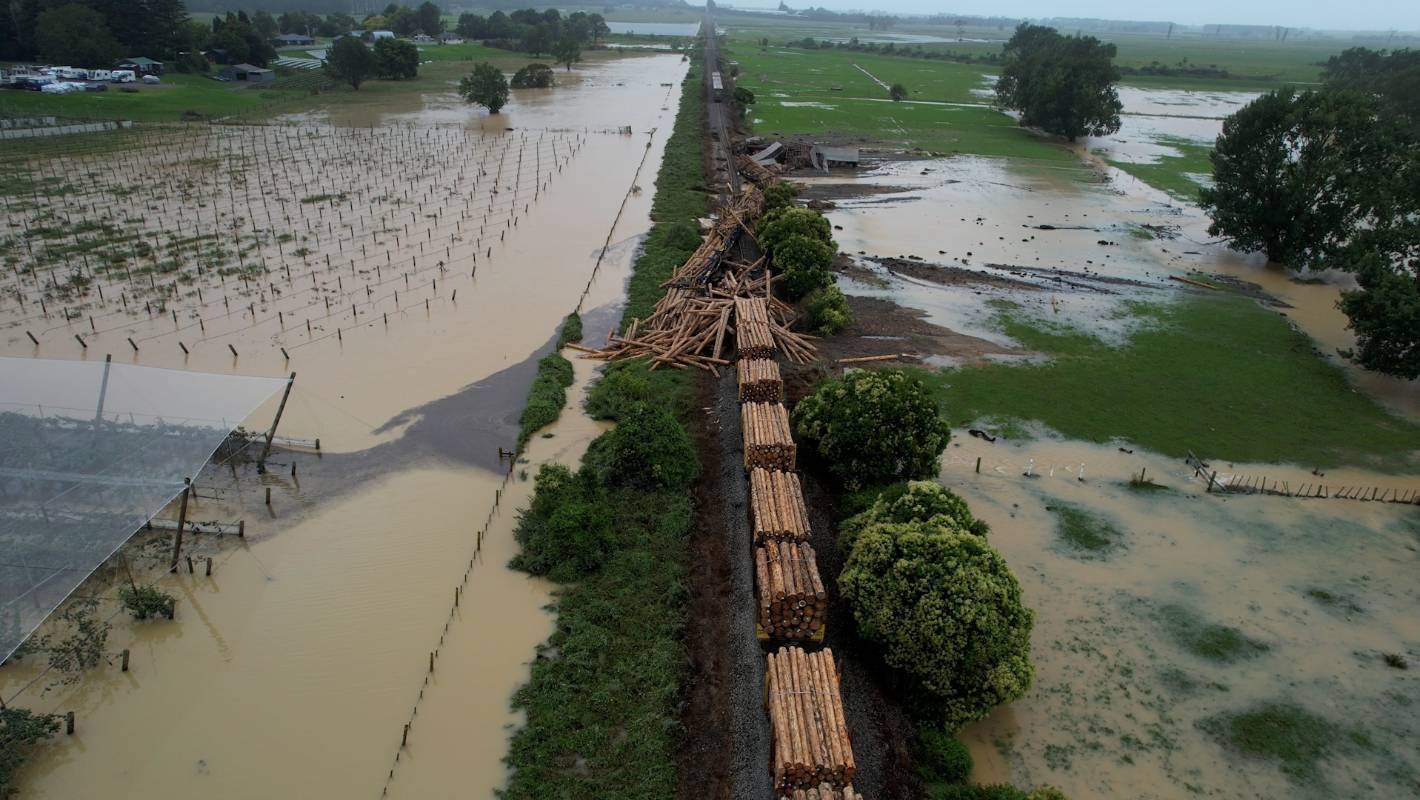 Flooding caused a freight train carrying logs to derail near Te Puke in January 2023. image source: drone footage by Jamie Troughton on Stuff.
