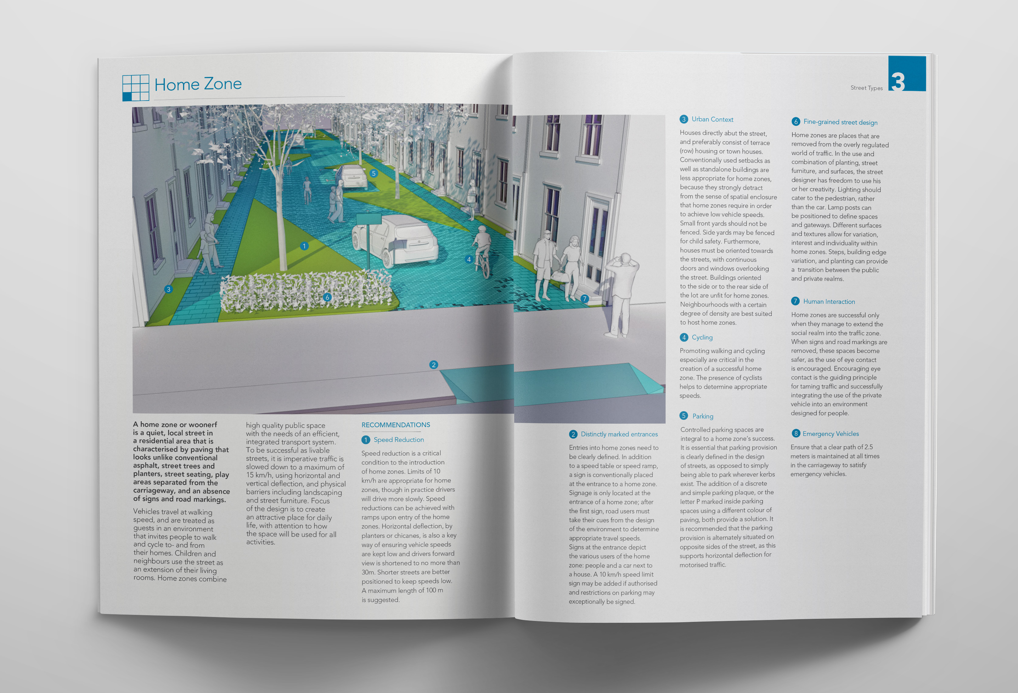 While practical the Street and Road Design Guide is intended to be inspirational and evocative. The Guide is richly illustrated with loose artwork communicating the principles, to more finely drawn mechanical drawings conveying geometric requirements.
