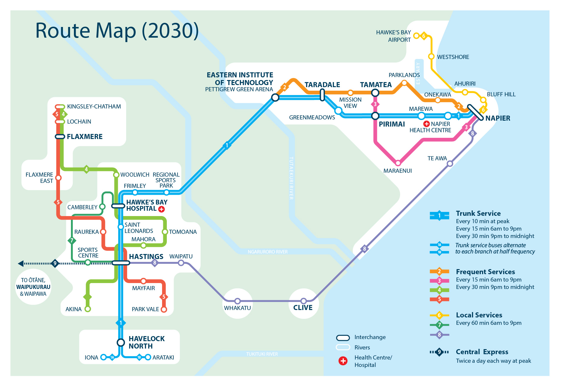 Our scope included three key pieces of work: reviewing the existing network’s operations and performance, designing a new network that can be implemented in stages by 2030, and helping HBRC to develop a new Regional Public Transport Plan.